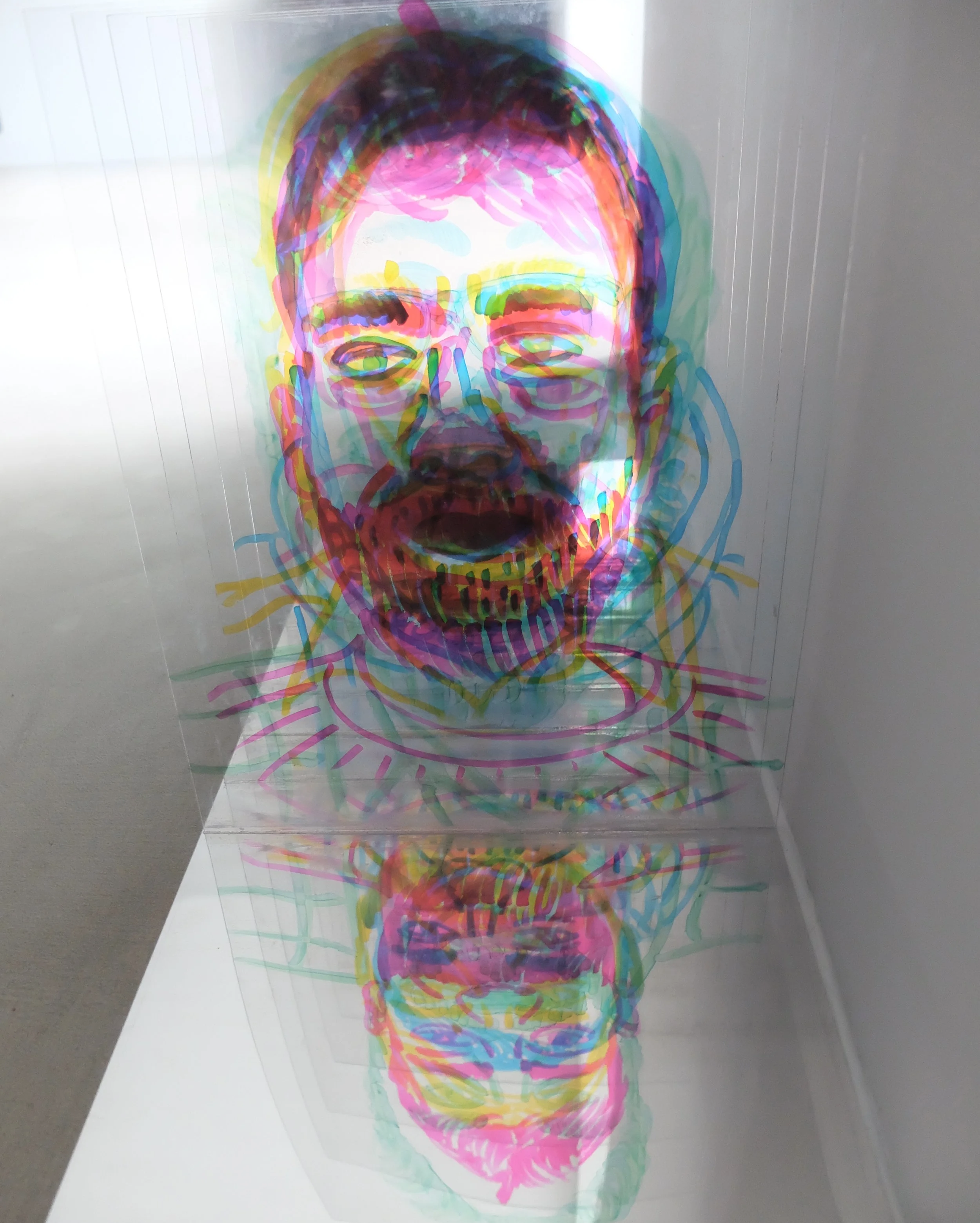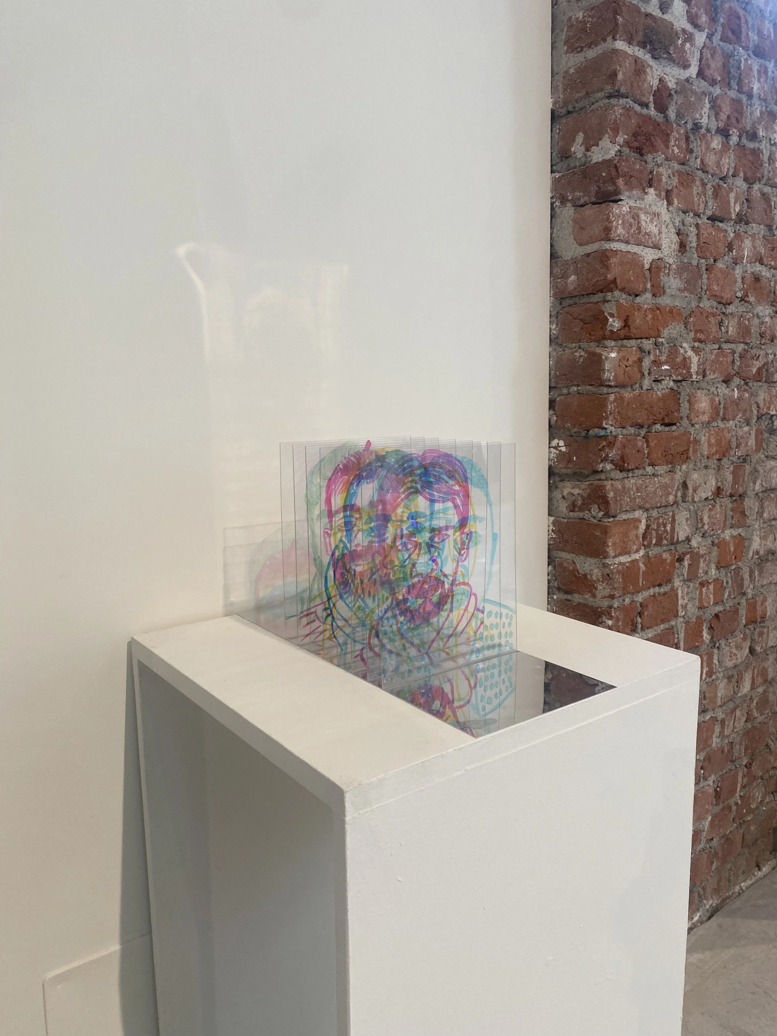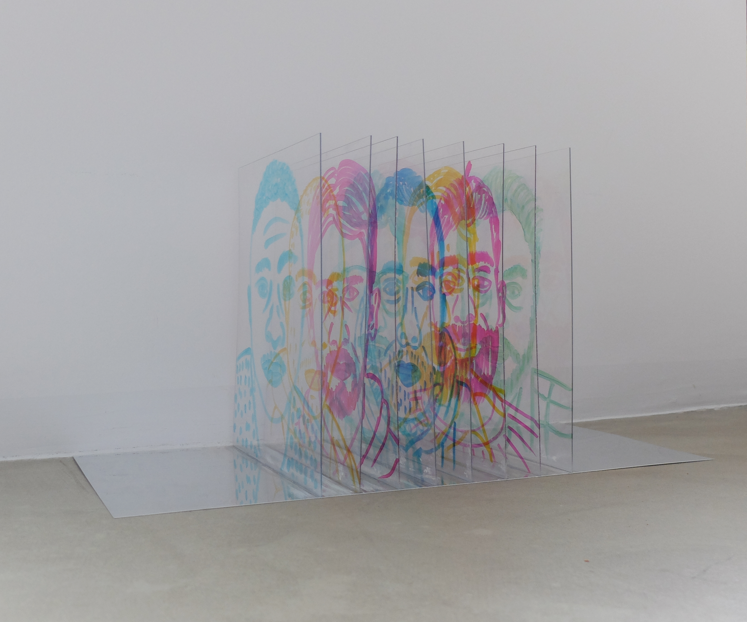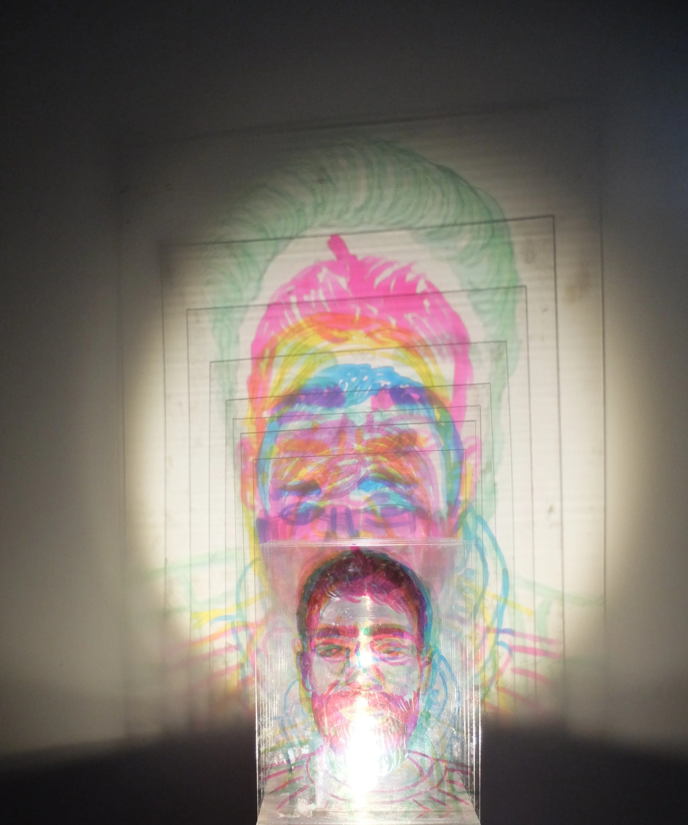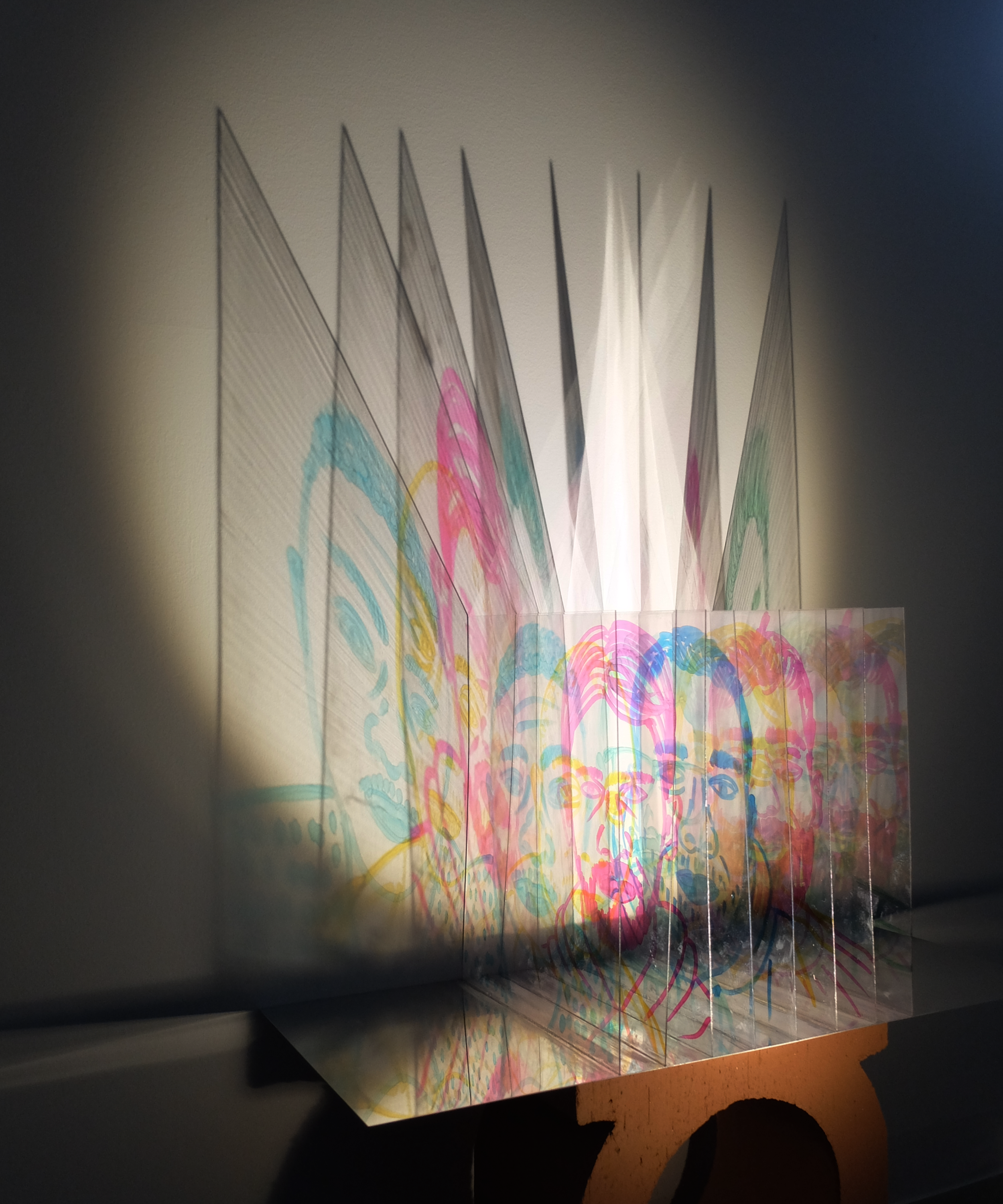 Proiezione su superficie neutra, in base alla posizione della luce e dell’opera, cambia l’effetto sulla parete ampliando il gioco di riflessi dei volti, creando identità effimere che scompaiono quando la luce svanisce, lasciando presenti i volti che si intersecano in trasparenza e si riflettono sulla base a specchio.