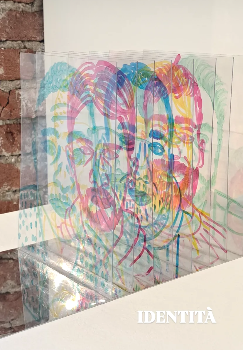 L’opera riflette sul concetto di identità: volti che si attraversano all’infinito generando alterità mutabili nel tempo e nello spazio.